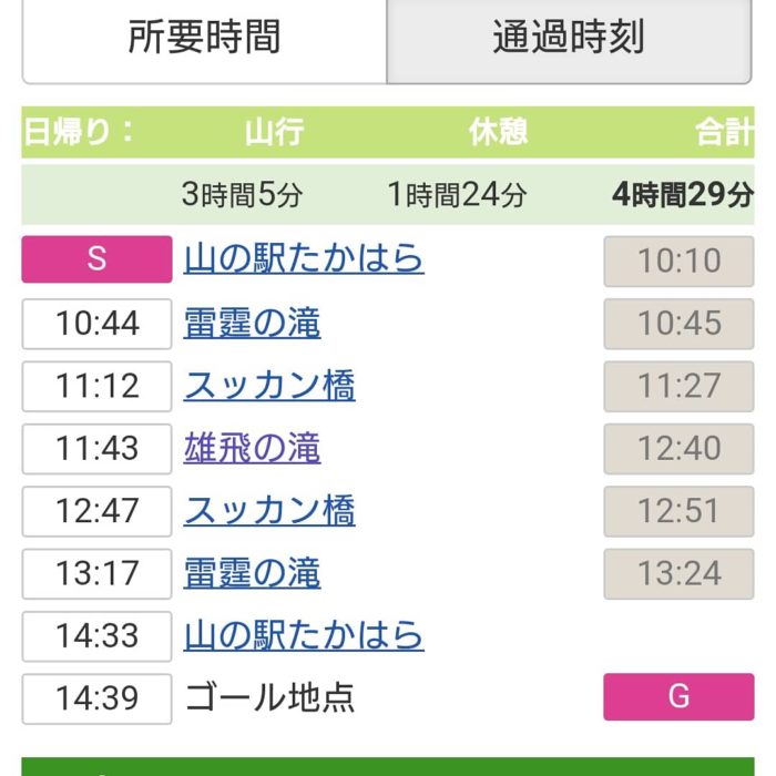 山の駅たかはら→雷霆の滝→スッカン橋→雄飛の滝→休憩→スッカン橋→雷霆の滝→山の駅たかはら