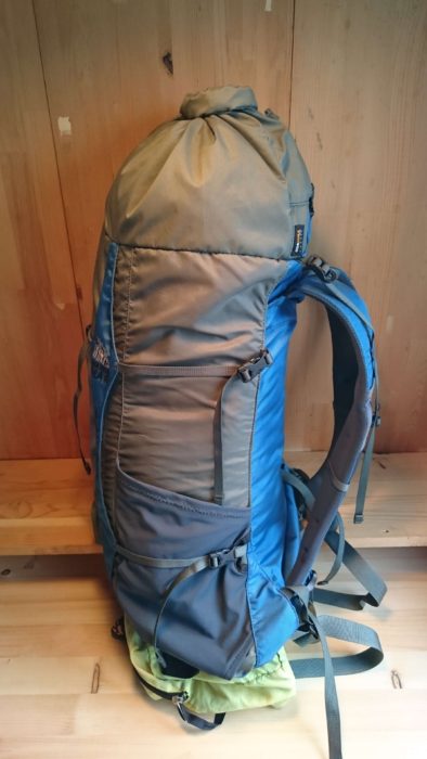 登山ザックにありがちな雨蓋を排してあり、ザック背面にフレームやパッド等の形を維持するような細工はないのでペラペラと頼りない。また、ザックの中身が背中にゴツゴツとあたって不快極まりない仕様となっているが、これこそがULなのだろう。この点においてのケアはマットをザック中に仕込むなどの工夫をするとよいらしい。ちなみに僕は使い古したサーマレストを半分にカットしたものを入れている。