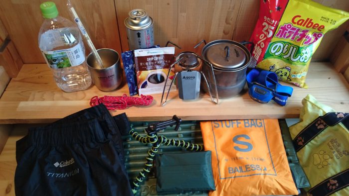 水2.5ℓ、カップ、割り箸、細引き、ガス管、コーヒー2杯分、SOTOのバーナー、やかん、ヘッドライト、お菓子、雨具、ゴリラポッド、ティッシュ、スタックバック小、小ぶりなポーチ、カップヌードル・おにぎり、サーマレスト(半分)