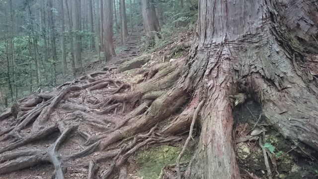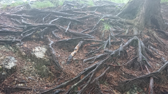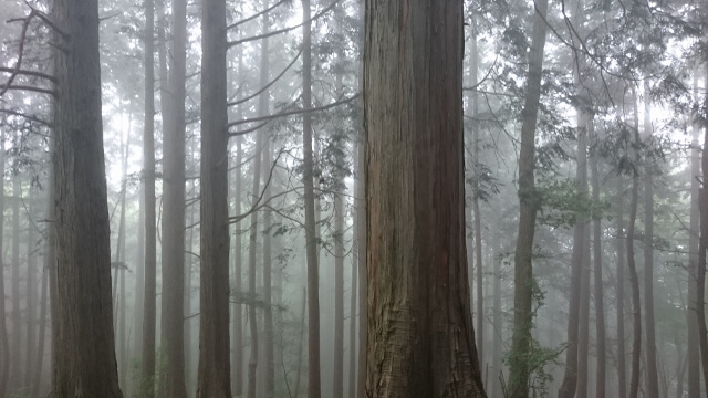 無数に顔をだした木の根は艶やかな照りをおび。ときおり強く落ちる雨に叩かれる葉音。渇いた木々がごくごくと雨を飲み込む音がする。霧の昇る杉林を見渡すと、奥行きのないのっぺりとした空間に木々が立ち並び、さらにその隙間には霞んだ木々の影が浮かびあがっていた。