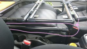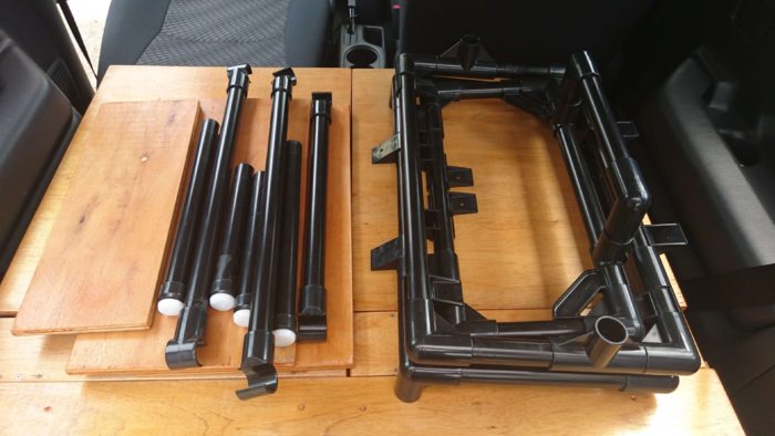 ※さらに強度が欲しいときは、倒した助手席背面シート下から後部の脚2本に梁を装着できるようにしている。