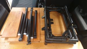 イレクターパイプを使用した物作りが初めてだったこともあり大変に苦戦した。時間と労力そして出費は想定をはるかに上回り。遊ぶ時間と小遣いを失った…。恐るべし初めてのイレクターパイプと言ったところだ。とはいえ、ようやく形になり残すはニス塗り作業だけとなった助手席部ベッドを眺めると甲斐があったなと感慨もひとしおだ。