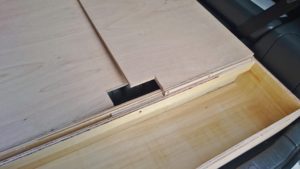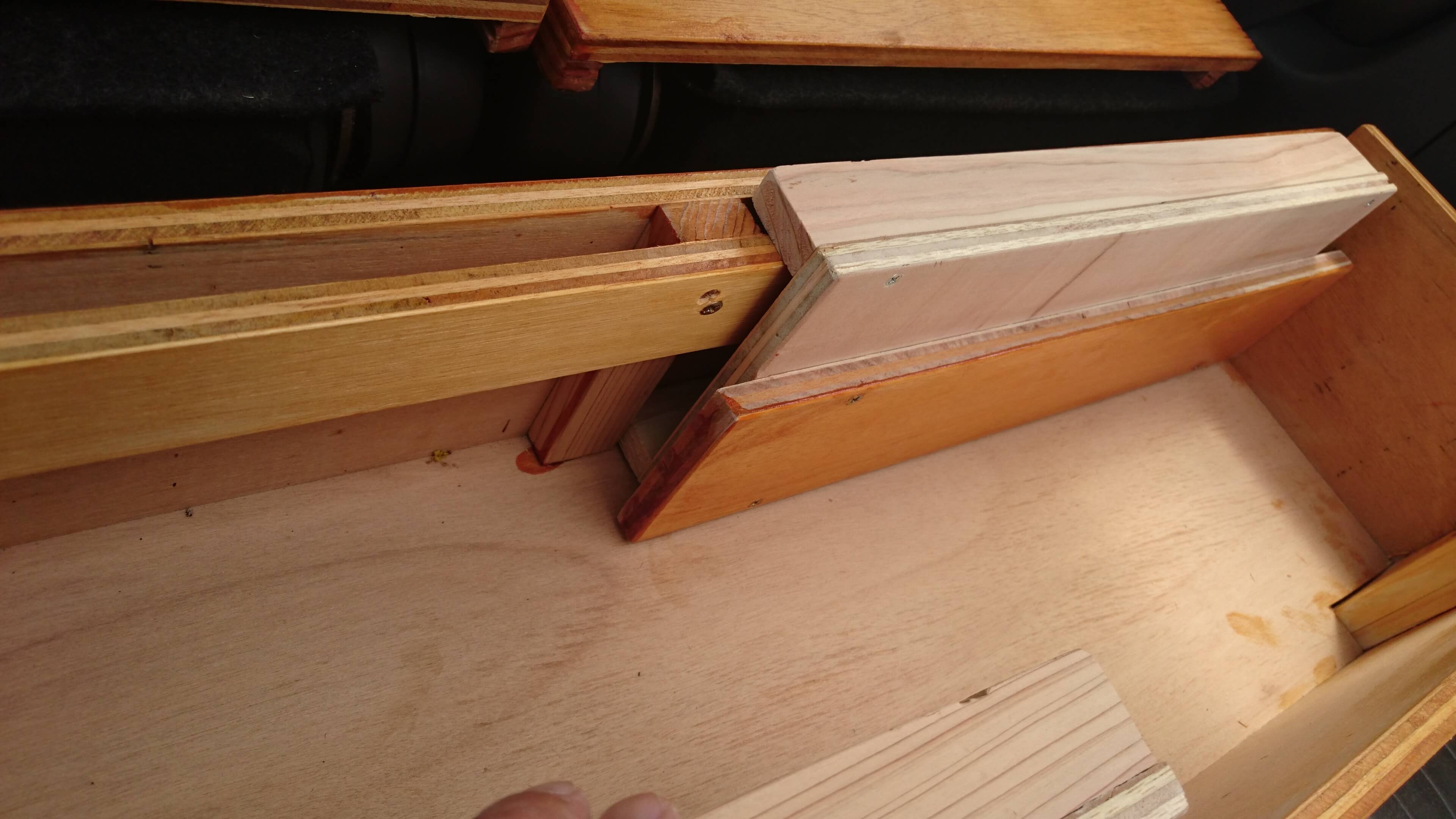 BOXの前面より後ろ面の高さを130mmほど低くし、収納時にはジョイントの脚部(厚さ120mm)をそこに掛けたたうえで、BOXの蓋で押さえるようにしたので、ガタガタ音も出ない。