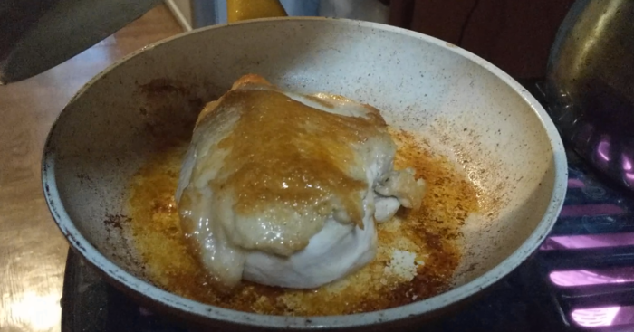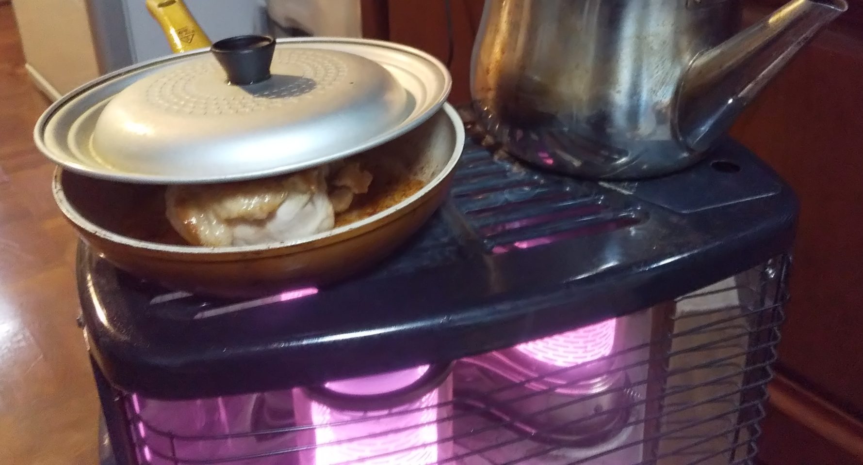 冬はストーブ調理 2020.02.29 2月末に今さらですが、冬になると部屋のストーブで調理をすることが増えます。汁ものをコトコト煮たり、少し大きめのチキンを焼くなんてときにも便利。何より部屋を暖めながら調理ができるところがよいですね。 仕事から帰ったらストーブに火を入れ、風呂と洗濯機にスイッチを入れる。夕飯の下ごしらえをしたら、ストーブに鍋やフライパンをおいておく。もろもろの家事を済ませ風呂に入っている間に夕飯が出来上がります。 この日もチキンを食べました。もちろん、調理はフライパンを置いておくだけです。