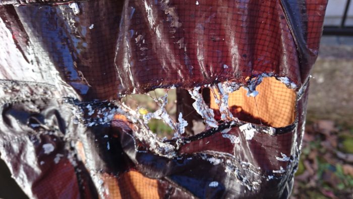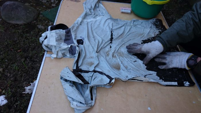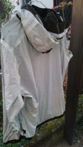 作業は背面、前面、フード部まで完了。水洗いをしてPUコーティングを流してから干し、各部の点検したところで、まさかの…。フード部分の裂け目に気がつく。