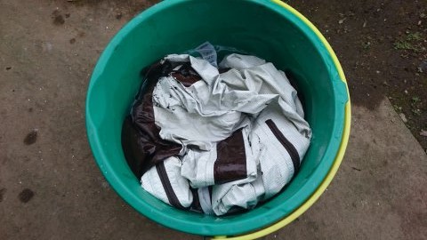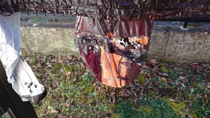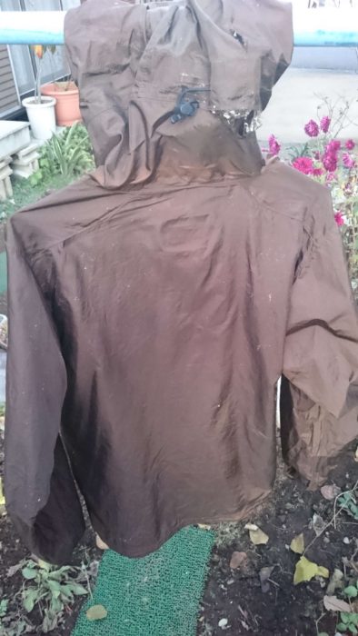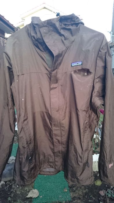思いおこせば長いこと野外に放置されたビニール製品ってやつはそろいもそろってポロポロになっているものだし、化繊の製品てやつはどれも湿度や温度の変化に脆弱で変色したり圧着部などが剥がれるもの。ならば、野外に放置しておけばトレントシェルジャケットのPUコーティングも劣化するのではないかと思った。作戦は決まった。放置プレイだ。