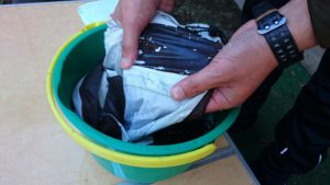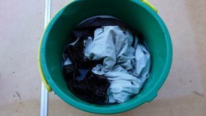 トレントシェルジャケットが入る大きさのバケツを用意。そこに60℃程度のお湯とキッチンハイタ―を注ぎ入れ溶液を作る。そこにトレントシェルジャケットを漬けること1時間。ときどき様子を見ながらモミモミする。