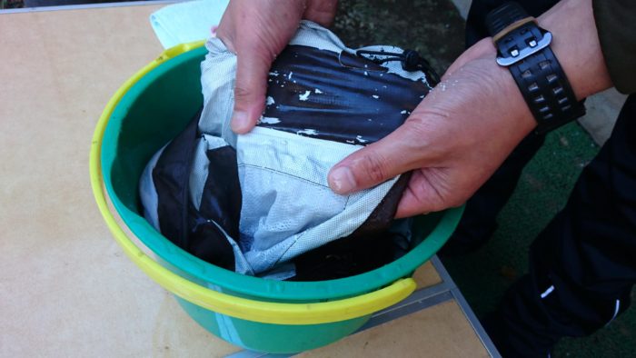 バケツに60℃程度のお湯と重曹を投入しジャケットを漬けること30分。その後、軽くモミモミしながら擦るとペロペロとコーティング面が剥がれる。
